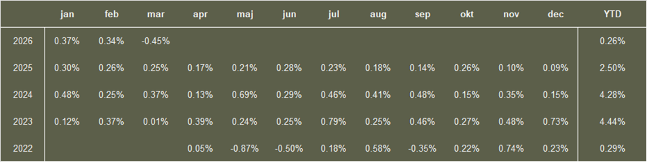 Bemærk at fonden ultimo marts 2022 skiftede til en ny strategi, med fokus på grønne obligationer.
